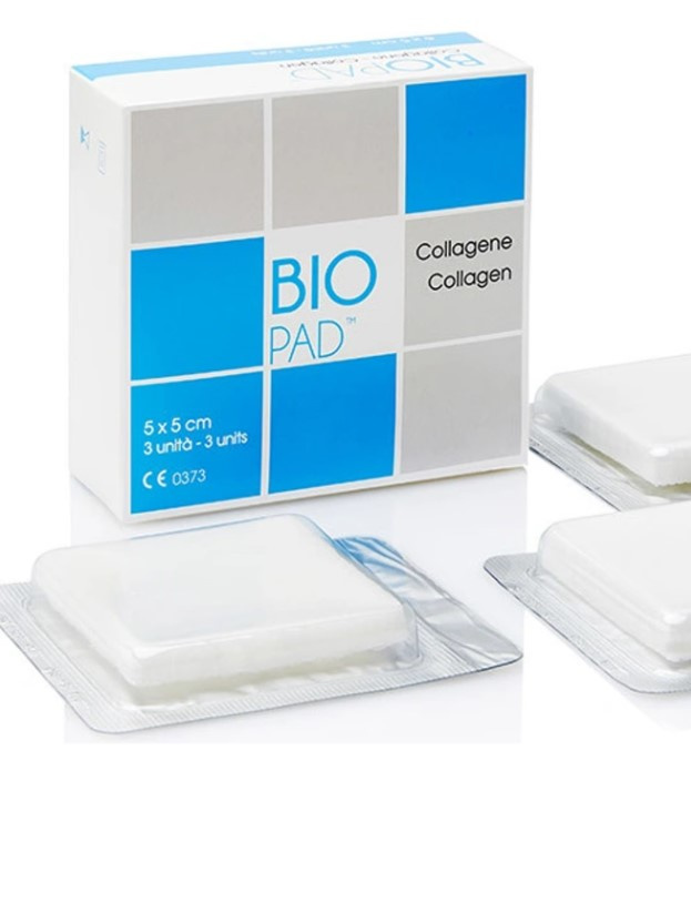 BIOPAD je kolagénové krytie vyrobené z prirodzeného heterológneho 100% čistého konského kolagénu typu I, je lyofilizovaný a sterilný vo forme hubovitých vankúšikov, ľahko sa tvarovo adaptuje na oblasti aplikácie.